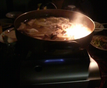 半闇鍋タイム。写真ほどは暗くない。しかし、火が通ってるかは判断できない。