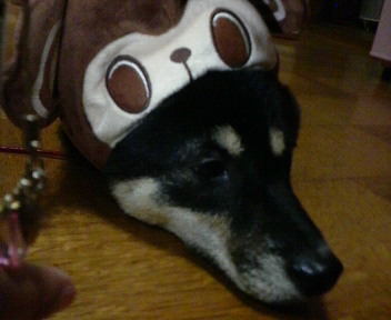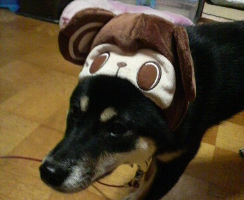 サル帽子を装着されたものの、被り心地がよくないので うんざり顔のちよこさん(11か月)。そっぽ向いた揚句、ため息まで吐く始末。