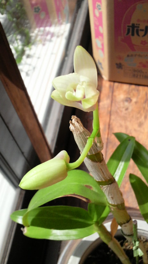 デンドロビウムの蕾がだいぶ大きくなっていたので、よく陽のあたる廊下に移動したら、1時間もしないうちに花が開いてました。