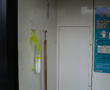 なぜか、精米所の壁に縄跳びが……。
